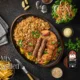 Yellow rice with grilled shish tawook pieces and grilled vegetables, served with mayonnaise and Mexican sauce.