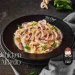 Penne pasta with Alfredo sauce with a piece of grilled chicken breast with herbs, mushroom pieces, garlic and onions