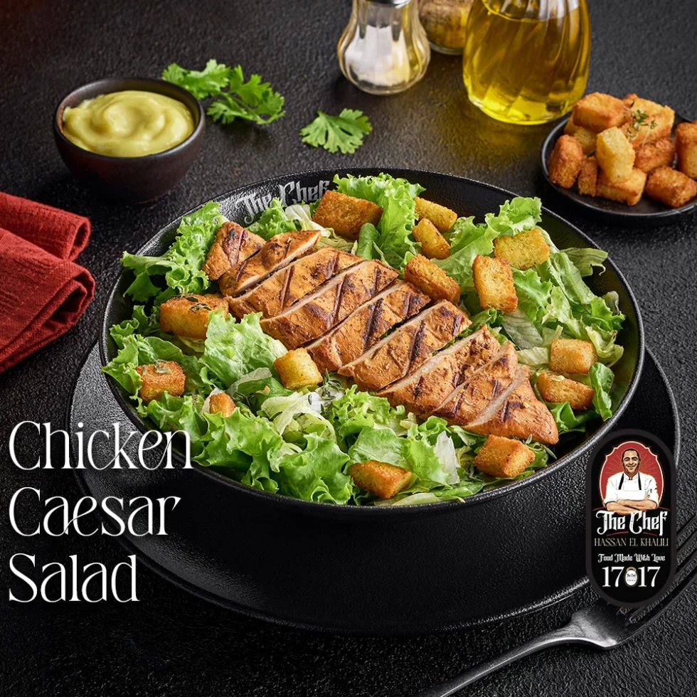 A piece of grilled chicken breast with lettuce and toasted herb bread mixed with Caesar sauce.