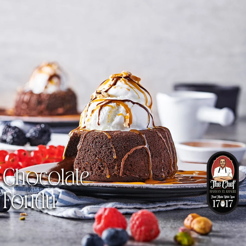 Chocolate cake stuffed with chocolate sauce. served with vanilla ice cream and vanilla sauce.