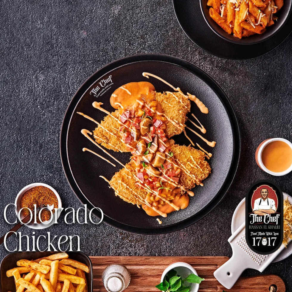 Two breasts of fried chicken with creamy tomato sauce mixed with cheese sauce, mushroom pieces, beef bacon, jalapeno pepper and herbs.