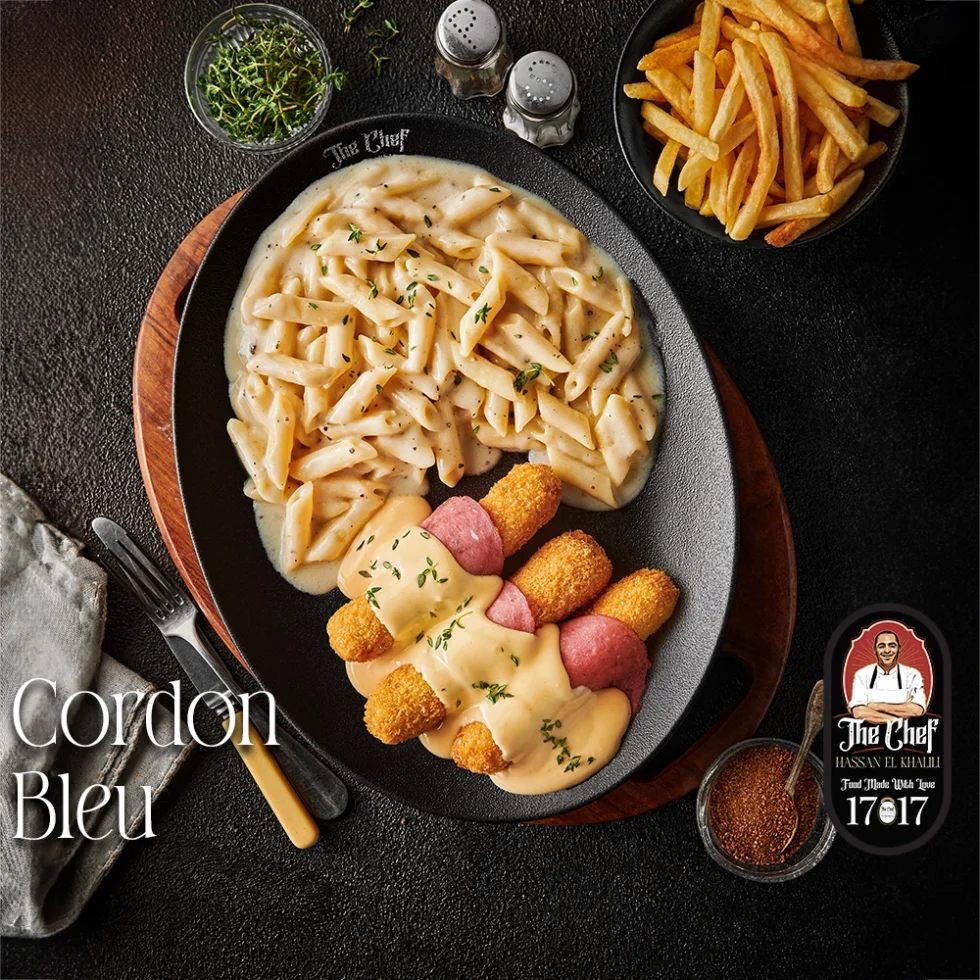 3 pieces of cordon bleu stuffed with cheese sauce and beef bacon, topped with cheese sauce and smoked beef.