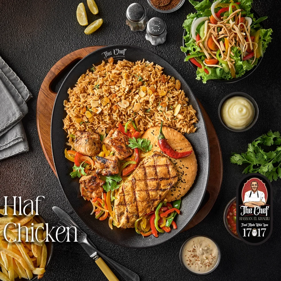 A piece of grilled breast on charcoal with 4 pieces of shish tawook and grilled vegetables, served with tahini, mayonnaise, Mexican sauce and bread.