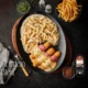 Yellow rice with shish tawook pieces, grilled kofta and grilled vegetables, served with mayonnaise and mexican sauce.