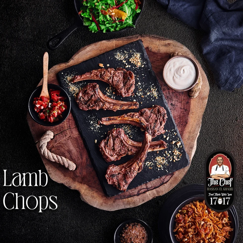 5 pieces of lamb chops served with rice topped by nuts and beet orange salad