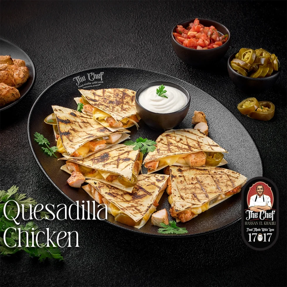 A mixture of grilled chicken, cheese and vegetables inside tortilla bread served with sour cream sauce, Mexican sauce and jalapeno.