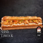 Charcoal grilled shish tawook with onions, bell peppers and sauced with mayonnaise sauce