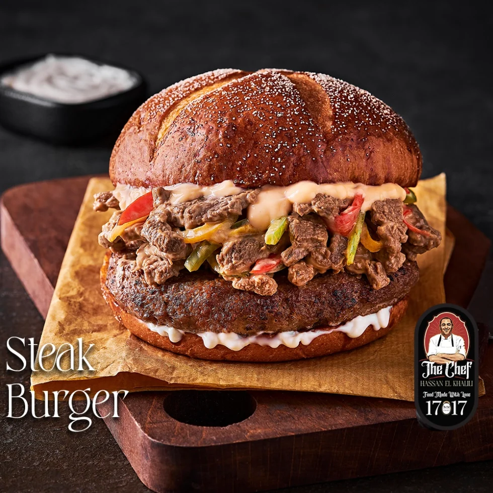 A beef burger patty with julienne beef steak pieces (280 grams), mayonnaise, onion pieces, peppers, cheese, cheddar sauce and burger…